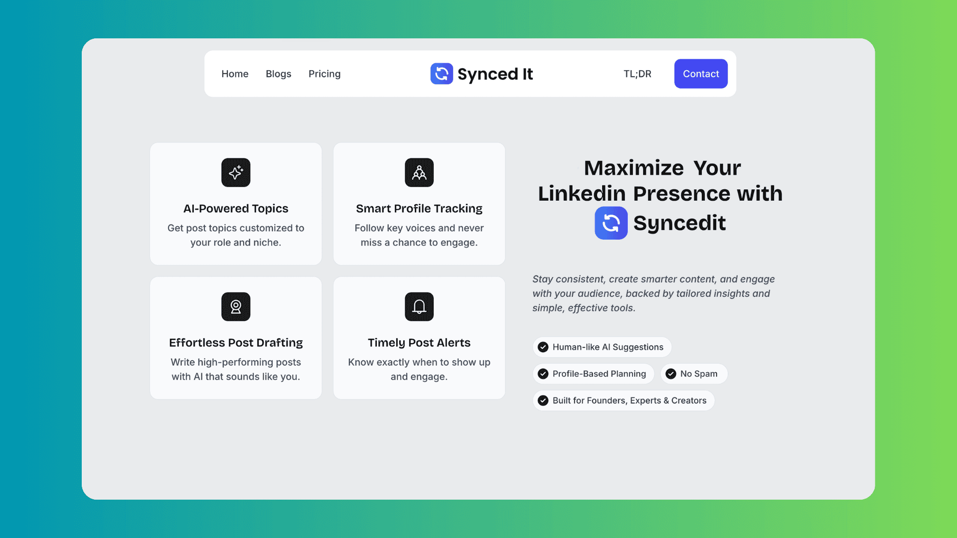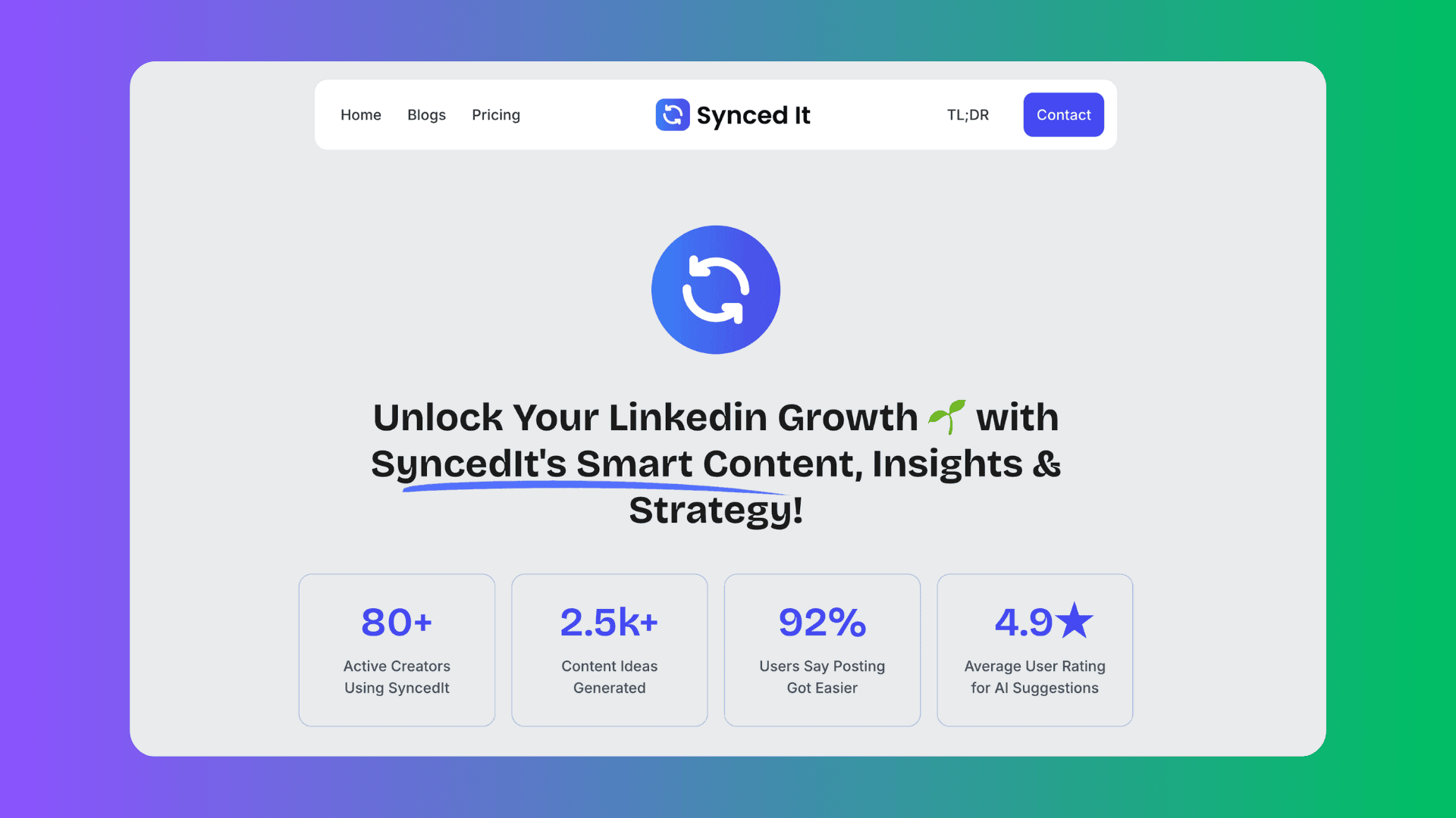 Instead of just client work, I also build and grow my own product. Syncedit is an AI-powered LinkedIn growth engine that helps founders grow their personal brand through content, engagement, and network amplification.